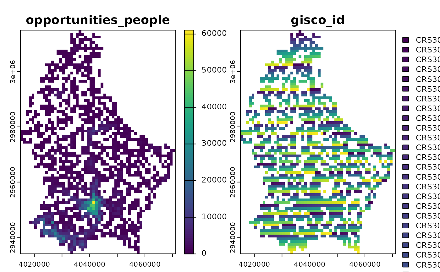 TRUE(the default), a second layer named "id" is added to the raster. This is a factor layer where the labels correspond to the INSPIRE-compliant grid cell ID for each cell.