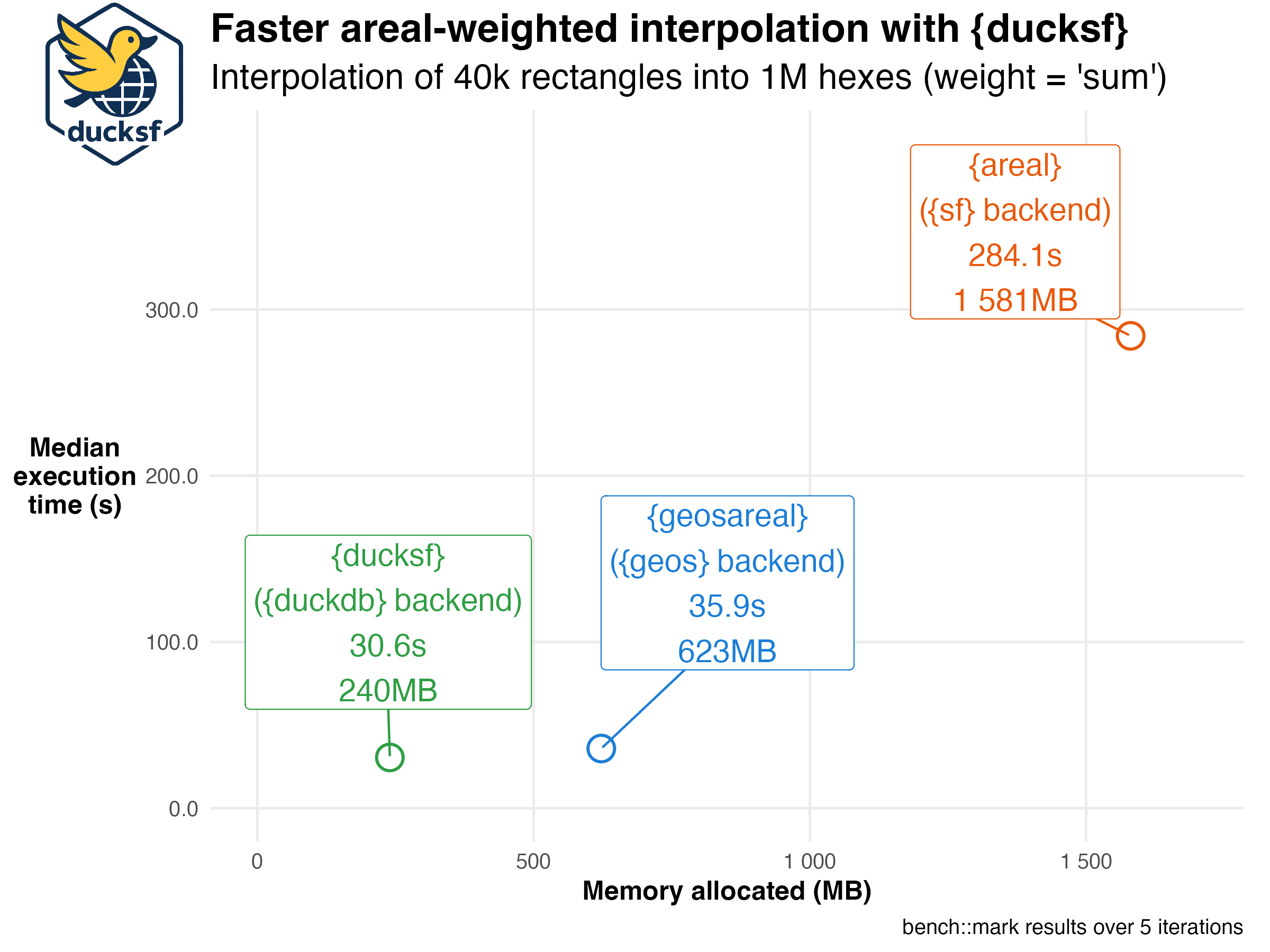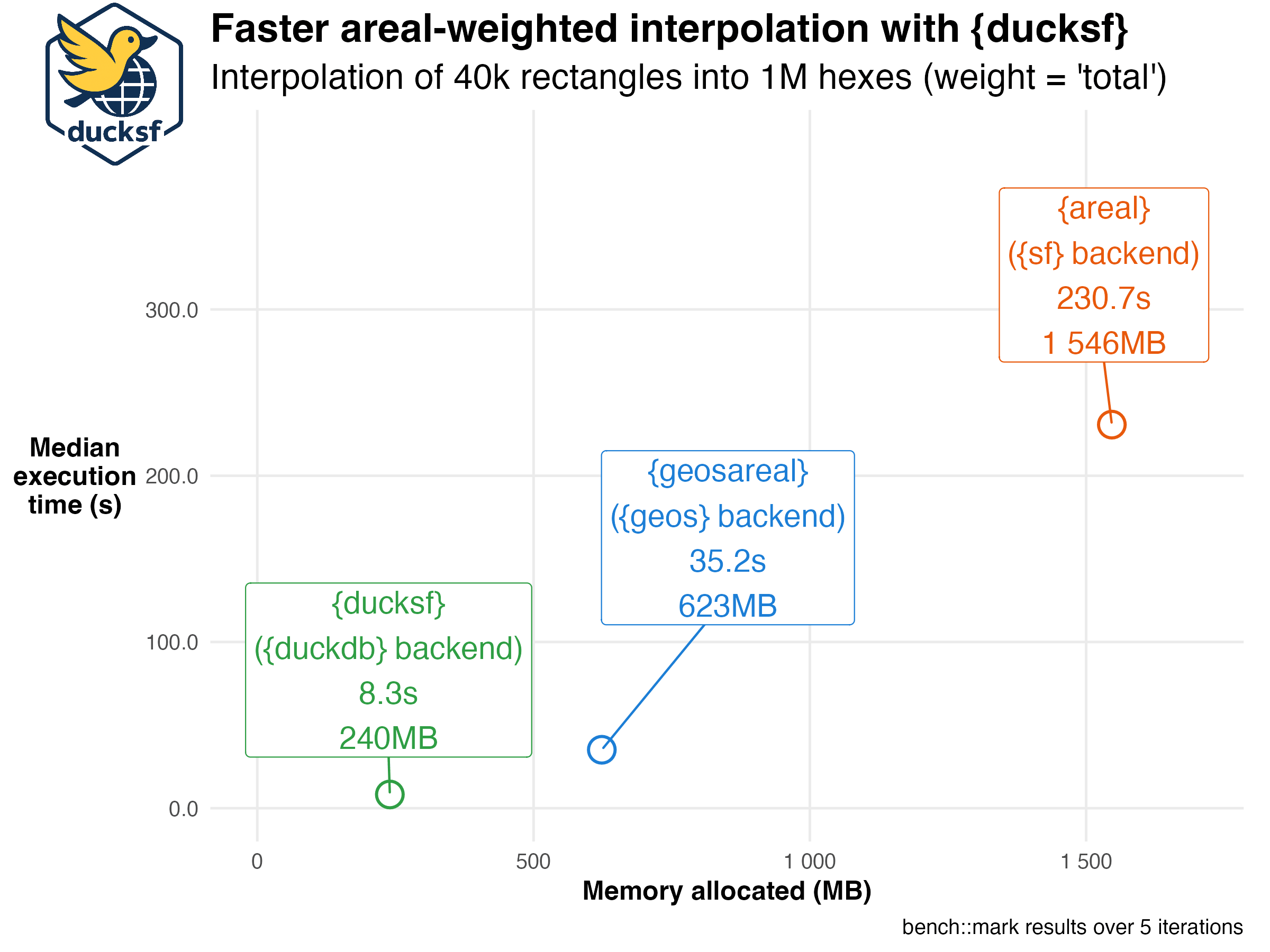 This package provides some alternatives to sf functions, which are implemented using duckdb and geoarrow. So far the only implemented function is areal interpolation working similar to the one found in ‘areal’ package, but much faster. I have no idea where this project will go, use at your own risk.