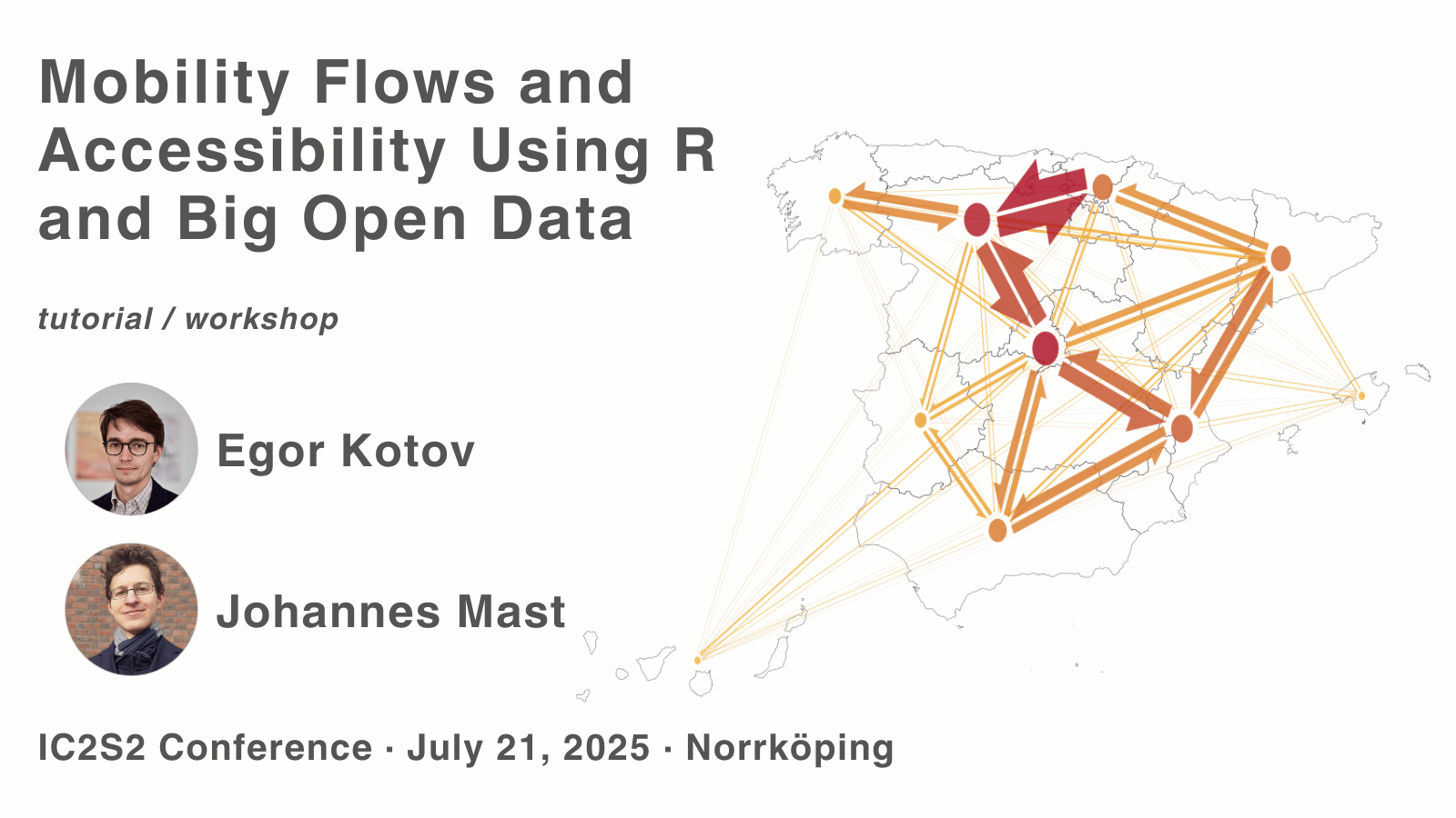 The workshop addresses these challenges by showcasing end-to-end workflows that harness state-of-the-art R packages and methods. Participants will learn how to acquire and manage multi-gigabyte mobility datasets on consumer level laptops, combine and compare the actual mobility flows and the access to opportunities, and create informative mobility flows visualizations.