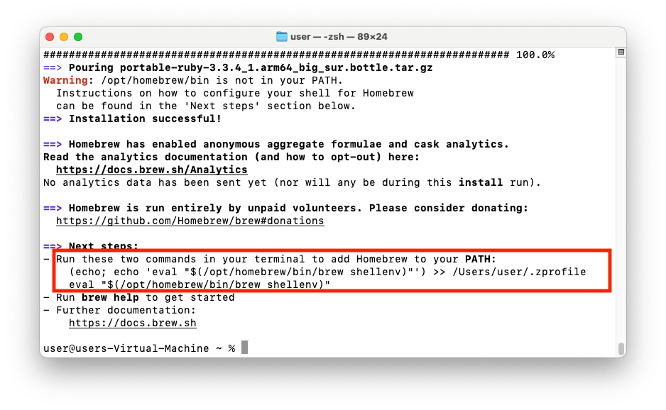 Homebrew is installed, follow the post-installation instructions by running the two commands you see in teh end of the output To finilise the process, follow the post-installation instructions by running the two commands you see in the end of the output. The first command is unique to you, because it includes your username. However, you can also use these parametrised username-agnostic commands below (