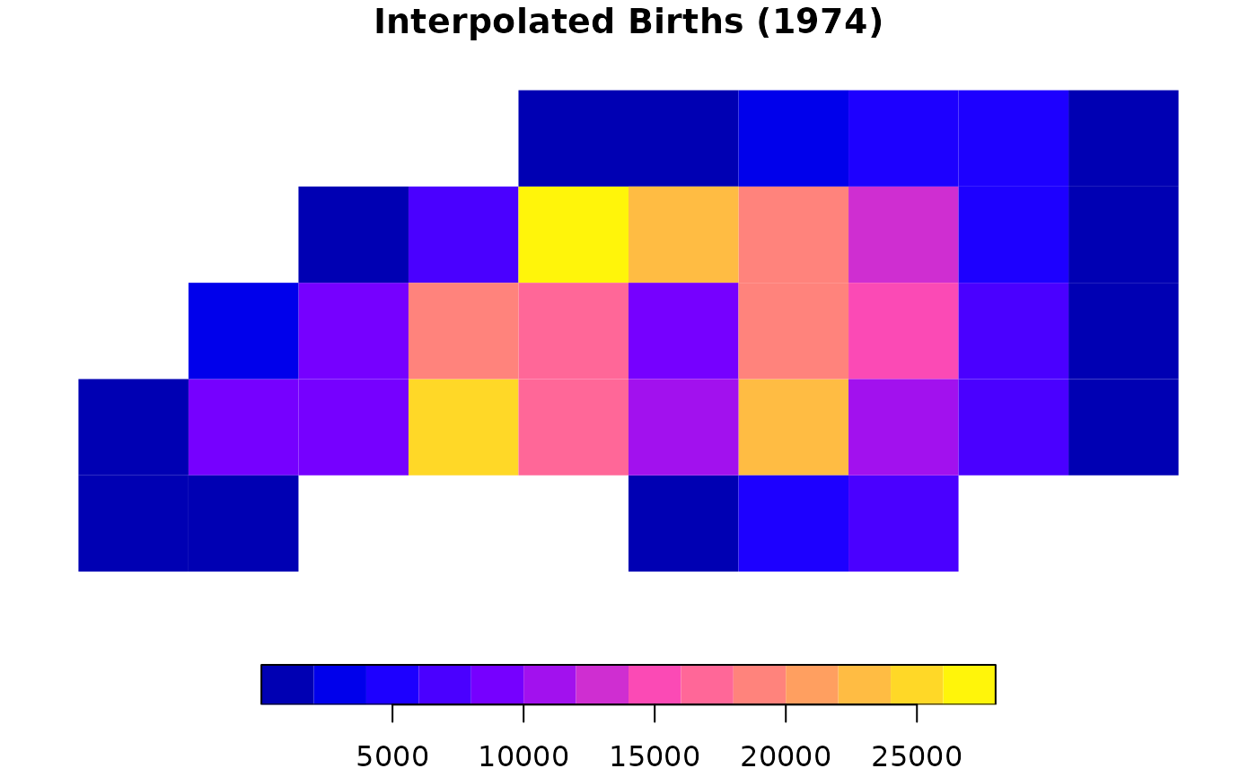 plot(result_ext["BIR74"], main = "Interpolated Births (1974)", border = NA)